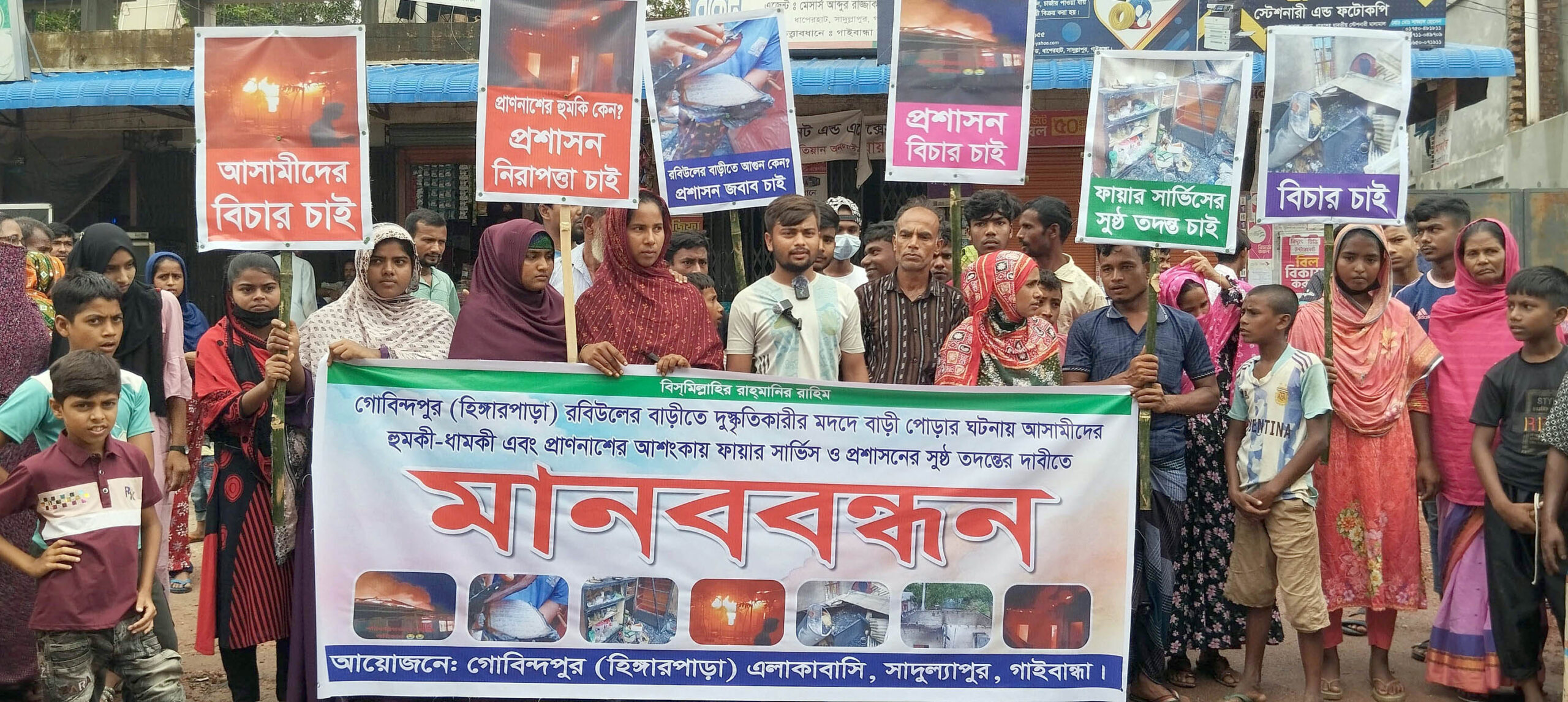 খবরবাড়ি ডেস্কঃ গাইবান্ধার সাদুল্লাপুর উপজেলার ধাপেরহাট ইউনিয়নের গোবিন্দপুর হিংগারপাড়া গ্রামে জমি নিয়ে বিরোধে রবিউল ইসলামের বসতবাড়িতে পরিকল্পিত অগ্নিসংযোগ ঘটনার সুষ্ঠু তদন্ত ও দোষীদের দৃষ্টান্তমূলক শাস্তির দাবীতে মানববন্ধন অনুষ্ঠিত হয়েছে।