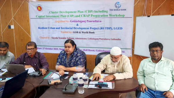 খবরবাড়ি নিজস্ব প্রতিবেদকঃ গাইবান্ধার গোবিন্দগঞ্জে বাংলাদেশ সরকার ও বিশ্বব্যাংকের অর্থায়নে এলজিইডি কর্তৃক বাস্তবায়নাধীন রিজিলিয়েন্ট আরবান এন্ড টেরিটরিয়াল ডেভেলপমেন্ট প্রজেক্ট(আরইউটিডিপি) এর আওতায় ক্লাস্টার ডেভেলপমেন্ট প্ল্যান শীর্ষক কর্মশালা অনুষ্ঠিত হয়েছে।