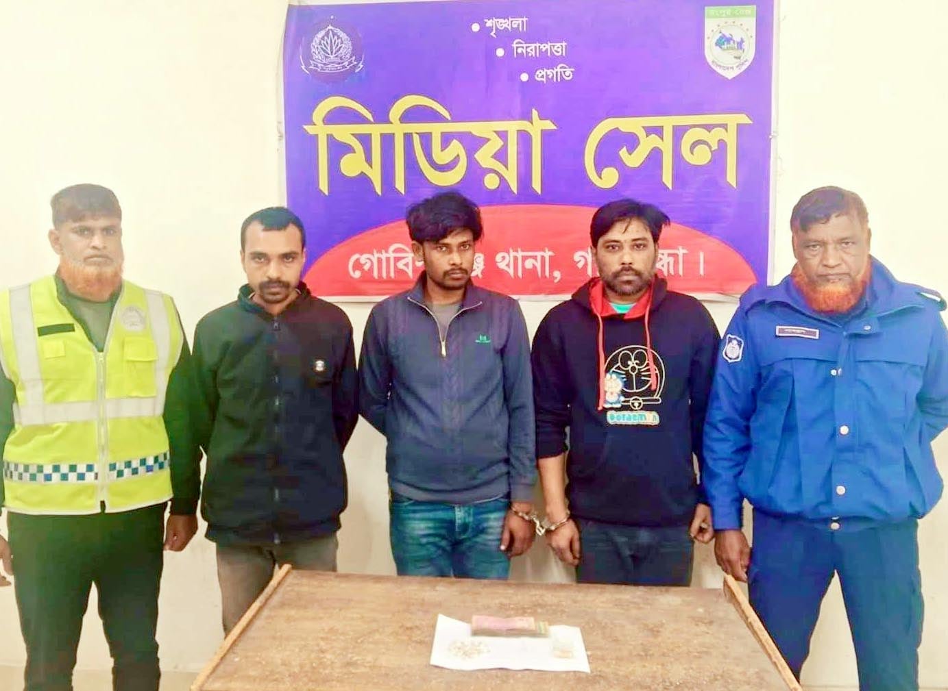 পুলিশ সূত্রে জানা গেছে, গোপন সংবাদের ভিত্তিতে শনিবার গভীর রাতে গোবিন্দগঞ্জ থানার উপ-পুলিশ পরিদর্শক (এসআই) নজরুল ইসলাম সঙ্গীয় পুলিশ ফোর্সসহ উপজেলার নাকাই ইউনিয়নের কুঞ্জ নাকাই গ্রামে বাবলু মিয়ার পরিত্যক্ত ঘরে মাদক বিরোধী অভিযান চালিয়ে মেহেদী হাসান সবুজ সরকার, আপেল মাহমুদ ও হুমায়ন কবিরকে গ্রেফতার করে। এসময় তল্লাশি চালিয়ে তাদের কাছ থেকে ৪৭ পুরিয়া হেরোইন, ২৭ পিস ইয়াবা, ১টি ধারালো চাপাতি ও মাদক বিক্রির নগদ ৩ হাজার ৭ শত টাকা উদ্ধার করা হয়।