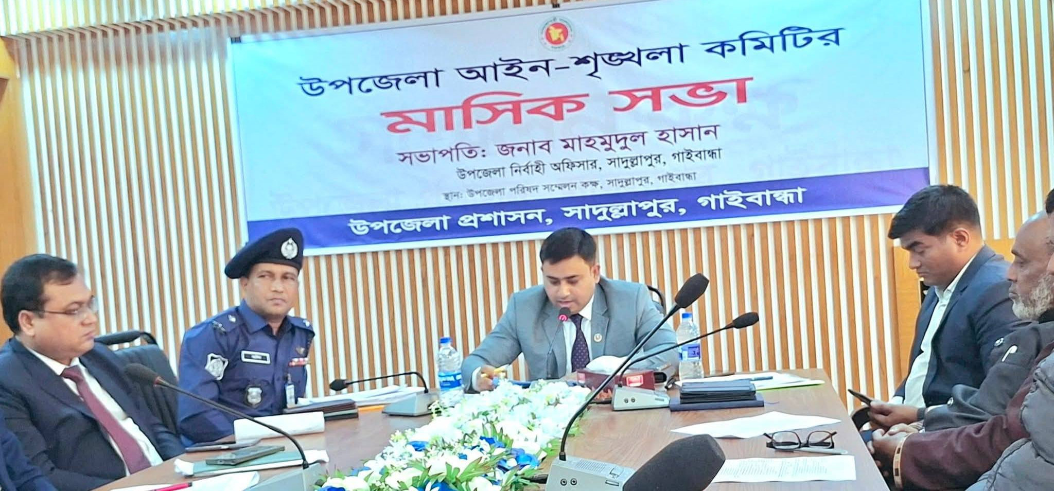 শহিদুল হক, সাদুল্লাপুর (গাইবান্ধা): গাইবান্ধার সাদুল্লাপুর উপজেলার আইন-শৃঙ্খলা পরিস্থিতি স্বাভাবিক রাখা এবং জননিরাপত্তা নিশ্চিতকরণের লক্ষ্যে উপজেলা আইন-শৃঙ্খলা কমিটির মাসিক সভা অনুষ্ঠিত হয়েছে।