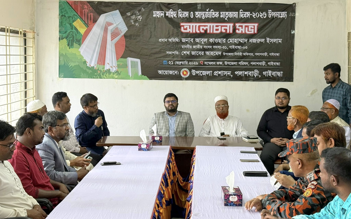 এদিন সকাল ১১টায় উপজেলা পরিষদ সম্মেলন কক্ষে দিবসটির গুরুত্ব ও তাৎপর্য উল্লেখ করে আলোচনা সভা অনুষ্ঠিত হয়। উপজেলা নির্বাহী অফিসার শেখ জাবের আহমেদ-এর সভাপতিত্বে সভায় প্রধান অতিথি হিসেবে বক্তব্য রাখেন গাইবান্ধা-৩ (পলাশবাড়ী-সাদুল্লাপুর) আসনের নবনির্বাচিত সংসদ সদস্য আবুল কাওসার মোহাম্মাদ নজরুল ইসলাম (লেবু মাওলানা)। উপজেলা একাডেমিক সুপারভাইজার মুহাম্মদ আলমগীর হুসেন-এর সঞ্চালনায় অন্যান্যদের মধ্যে বক্তব্য রাখেন সহকারি কমিশনার (ভূমি) মো. আল-ইয়াসা রহমান তাপাদার, উপজেলা বিএনপির আব্দুস সামাদ মন্ডল, উপজেলা জামায়াতে ইসলামীর আমীর কিশোরগাড়ী ইউপি চেয়ারম্যান আবু বক্কর সিদ্দিক, বৈষম্যবিরোধী আন্দোলন জেলার মুখ্য সংগঠক মাসুদ রানা শেখ প্রমুখ। এসময় উপজেলা প্রশাসনের অপরাপর দপ্তরের কর্মকর্তা ছাড়াও শিক্ষক, রাজনৈতিক, সামাজিক, সাংস্কৃতিক ও পেশাজীবি সংগঠনের নেতৃবৃন্দ উপস্থিত ছিলেন।