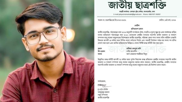 বৃহস্পতিবার (১২ মার্চ) জাতীয় ছাত্রশক্তির দপ্তর সম্পাদক মাহফুজুর রহমান স্বাক্ষরিত এক সংবাদ বিজ্ঞপ্তিতে এই তথ্য জানানো হয়।