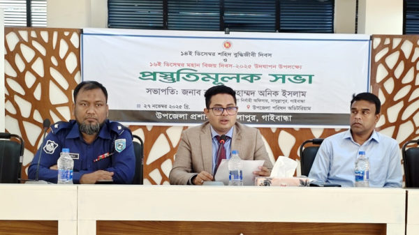 খবরবাড়ি নিজস্ব প্রতিবেদকঃ সাদুল্লাপুরে শহীদ বুদ্ধিজীবী দিবস ও মহান বিজয় দিবস উদযাপন উপলক্ষে প্রস্তুতিমূলক সভা অনুষ্ঠিত হয়েছে। বৃহস্পতিবার (২৭ নভেম্বর) সকাল সাড়ে ১১টায় উপজেলা পরিষদ হলরুমে অনুষ্ঠিত এ সভায় সভাপতিত্ব