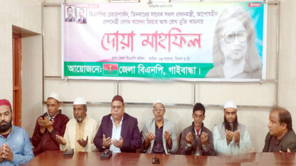 খবরবাড়ি ডেস্কঃ বিএনপির চেয়ারপারসন ও সাবেক প্রধানমন্ত্রী বেগম খালেদা জিয়ার রোগমুক্তি কামনায় গাইবান্ধায় দোয়া মাহফিল অনুষ্ঠিত হয়েছে। জেলা বিএনপির উদ্যোগে শনিবার (২৯ নভেম্বর) বিকেলে জেলা বিএনপি কার্যালয়ে এ দোয়া মাহফিল