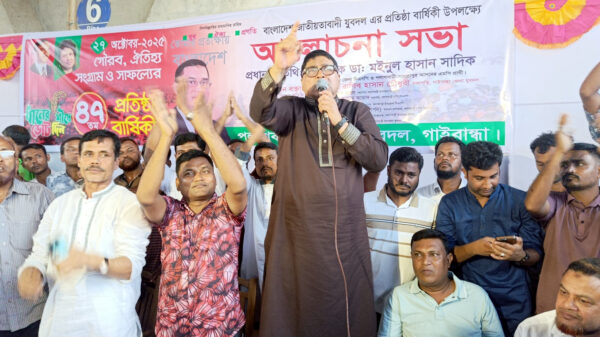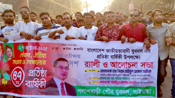 খবরবাড়ি ডেস্কঃ জাতীয়তাবাদী যুবদলের ৪৭তম প্রতিষ্ঠাবার্ষিকী পালন উপলক্ষে গাইবান্ধার পলাশবাড়ী পৌর যুবদলের উদ্যোগে র্যালী ও আলোচনা সভা অনুষ্ঠিত হয়েছে। মঙ্গলবার (২৮ অক্টোবর) বিকেলে পলাশবাড়ী পৌরশহরের তিনমাথা মোড় হতে একটি র্যালী