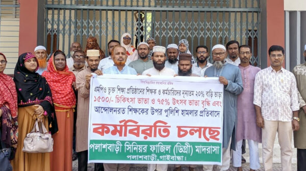 খবরবাড়ি ডেস্কঃ গাইবান্ধার পলাশবাড়ী উপজেলায় বেসরকারি এমপিওভূক্ত সকল শিক্ষাপ্রতিষ্ঠানে অনির্দিষ্টকালের জন্য কর্মবিরতি কর্মসূচি শুরু হয়েছে। এমপিওভূক্ত শিক্ষক জাতীয়করণ প্রত্যাশী জোটের আয়োজনে গত রোববার ঢাকা প্রেস কাবের সামনে বেসরকারি শিক্ষকদের বেতনের