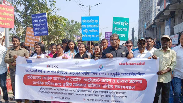 খবরবাড়ি ডেস্কঃ হরিজনসহ প্রান্তিক জনগোষ্ঠীর হোটেল-রেস্তোরাঁয় প্রবেশ ও খাবার গ্রহণের নাগরিক অধিকার এবং ভূমির অধিকার প্রতিষ্ঠার দাবীতে গাইবান্ধায় মানববন্ধন ও র্যালী অনুষ্ঠিত হয়েছে। সোমবার (১০ নভেম্বর) দুপুর ১২টার দিকে শহরের