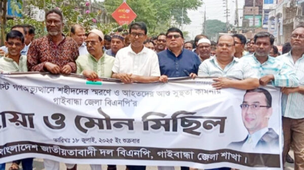 খবরবড়ি ডেস্কঃ জুলাই-আগস্ট গণঅভ্যুত্থানে শহীদদের স্মরণে ও আহতদের আশু সুস্থতা কামনায় গাইবান্ধা জেলা বিএনপির উদ্যোগে দো’আ ও মৌন মিছিল অনুষ্ঠিত হয়েছে। শুক্রবার (১৮ জুলাই) সকাল ১১টায় জেলা বিএনপির উদ্যোগে দো’আ