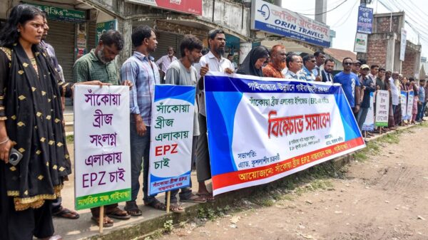 খবরবড়ি ডেস্কঃ গাইবান্ধা-পলাশবাড়ী সড়কের সাঁকোয়া ব্রিজ এলাকায় ইপিজেড স্থাপনের দাবীতে গাইবান্ধা সাকোয়া ব্রিজ ইপিজেড বাস্তবায়ন মঞ্চের উদ্যোগে বিক্ষোভ সমাবেশ অনুষ্ঠিত হয়েছে। শুক্রবার (১৮ জুলাই) ১০টায় গাইবান্ধা শহরের গানাসাস মার্কেটের সামনে