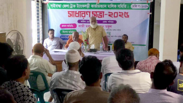 খবরবাড়ি ডেস্কঃ গাইবান্ধা জেলা ট্রাক, ট্যাংকলড়ী ও কার্ভাডভ্যান মালিক সমিতির সাধারণ সভা অনুষ্ঠিত হয়েছে। শনিবার (১৪ জুন) শহরের সমিতির কার্যালয়ে এ সভা অনুষ্ঠিত হয়। সভায় প্রধান অতিথি হিসেবে উপস্থিত ছিলেন