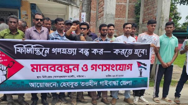 খবরবাড়ি ডেস্কঃ ফিলিস্তিনের গাজায় গণহত্যা বন্ধের প্রতিবাদে হেযবুল তাওদীদ গাইবান্ধা জেলা শাখার উদ্যোগে মানববন্ধন ও গণসংযোগ অনুষ্ঠিত হয়েছে। রোববার (২৫ মে) সকালে শহরের ১নং ট্রাফিক মোড় গানাসাস মার্কেটের সামনে এ