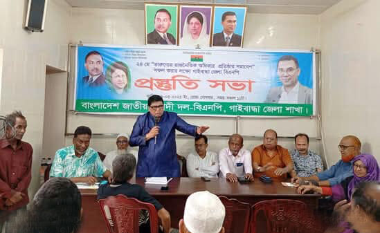 খবরবাড়ি ডেস্কঃ আগামী ২৪ মে ‘তারুণ্যের রাজনৈতিক অধিকার প্রতিষ্ঠার সমাবেশ’ সফল করার লক্ষ্যে গাইবান্ধা জেলা বিএনপির উদ্যোগ প্রস্তুতি সভা অনুষ্ঠিত। প্রস্তুতি সভায় সভাপতিত্ব করেন জেলা বিএনপির সভাপতি অধ্যাপক ডা. মইনুল