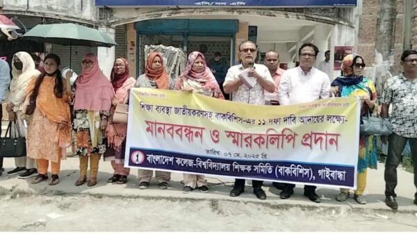 খবরবাড়ি ডেস্কঃ শিক্ষা ব্যবস্থা জাতীয়করণসহ ১১ দফা দাবী আদায়ের বুধবার বাকবিশিস গাইবান্ধা জেলা শাখার উদ্যোগে লক্ষ্যে শহরের ডিবি রোড গানাসার্স মার্কেটের সামনে এক মানববন্ধন কর্মসূচি পালন করা হয়। মানববন্ধন শেষে