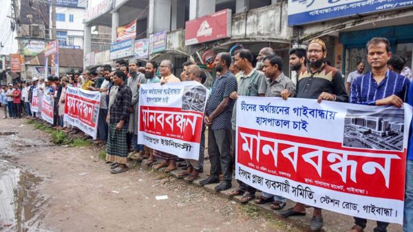 খবরবাড়ি ডেস্কঃ চীনের প্রস্তাবিত ১০০০ হাজার শয্যা বিশিষ্ট হাসপাতালটি গাইবান্ধায় প্রতিষ্ঠার দাবীতে ব্যবসায়ীসহ সর্বস্তরের জনগণ সোচ্চার হয়ে উঠেছেন। মঙ্গলবার (২২ এপ্রিল) গাইবান্ধা শহরের ডিবি রোডে এক কিলোমিটারব্যাপী মানববন্ধন কর্মসূছি অনুষ্ঠিত