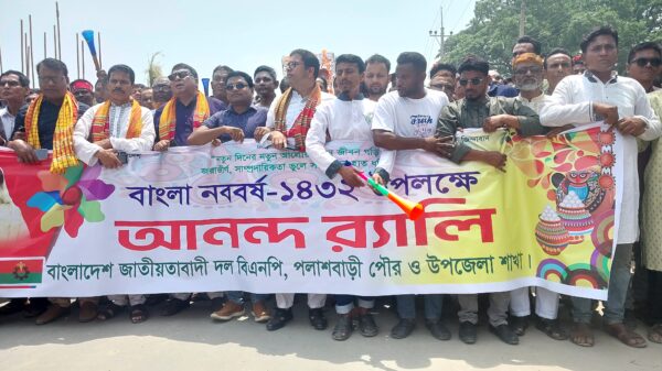 নতুন দিনের নতুন আলো নতুন জীবন গড়ি,জরাজীর্ণ সাম্প্রদায়িকতা ভুলে সম্প্রীতির হাত ধরি, এই প্রতিপাদ্য কে সামনে রেখে বাংলা নববর্ষ ১৪৩২ বঙ্গাব্দ কে স্বাগত জানিয়ে আনন্দ র্যালি বের করেছে বাংলাদেশ জাতীয়তাবাদী