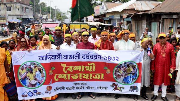 খবরবাড়ি ডেস্কঃ গাইবান্ধায় বাংলা নববর্ষ-১৪৩২ বঙ্গাব্দ পহেলা বৈশাখ বাজনার তালে তালে বরণ করে নিলেন আদিবাসী ও বাঙালি সম্প্রদায়। সোমবার (১৪ এপ্রিল) বেলা ১১টায় স্থানীয় ডাকবাংলো মোড় থেকে শোভাযাত্রা বের হয়ে