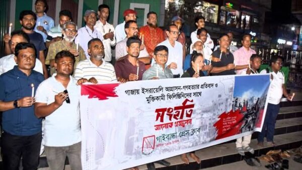 খবরবাড়ি ডেস্কঃ গাজায় ইসরায়েলি আগ্রাসন-বর্বর হত্যাযজ্ঞের প্রতিবাদ ও হত্যাযজ্ঞের শিকার অসংখ্য শিশু- নারী-পুরুষের প্রতি শ্রদ্ধা জানিয়ে আলোকপ্রজ্জ্বলন করে গণহত্যা বন্ধের জোর দাবী জানিয়েছেন গাইবান্ধার সাংবাদিকরা। গাইবান্ধা প্রেসকাবের উদ্যোগে বৃহস্পতিবার (১০