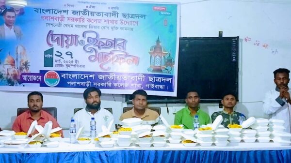 খবরবাড়ি ডেস্কঃ গাইবান্ধার পলাশবাড়ী সরকারি কলেজ শাখা ছাত্রদলের আয়োজনে সাবেক প্রধানমন্ত্রী বেগম জিয়ার রোগমুক্তি কামনায় দো’আ ও ইফতার মাহফিল অনুষ্ঠিত হয়েছে। বৃহস্পতিবার (২৭ মার্চ) অত্র কলেজ হলরুমে দো’আ ও ইফতার
