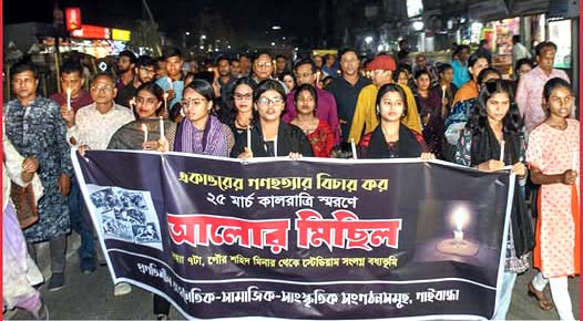 খবরবাড়ি ডেস্কঃ ১৯৭১ সালের ২৫ মার্চ কালোরাত্রিতে গণহত্যার শহীদদের স্মরণে গাইবান্ধার আলোর মিছিল অনুষ্ঠিত হয়েছে। মঙ্গলবার (২৫ মার্চ) সন্ধায় গাইবান্ধার প্রগতিশীল রাজনৈতিক-সামাজিক-সাংস্কৃতিক সংগঠনসমূহের ব্যানারে পৌর শহীদ মিনার চত্বর থেকে একটি