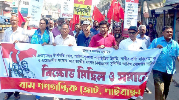 খবরবাড়ি ডেস্কঃ সারাদেশে অব্যাহত ধর্ষণ-নির্যাতন-সব সন্ত্রাস বন্ধ, জনগণের জানমালের নিরাপত্তা প্রদান, ঈদের আগেই শ্রমিকদের বেতন-বোনাস প্রদান ও জাতীয় নির্বাচনের সুনির্দিষ্ট তারিখ ঘোষণার দাবীতে দেশব্যাপী কর্মসূচির অংশ হিসেবে বিক্ষোভ মিছিল ও