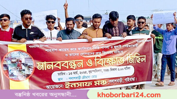 খবরবাড়ি ডেস্কঃ গাইবান্ধার পলাশবাড়ীতে ইনসাফ মঞ্চের আয়োজনে শাহবাগ কায়েম করে ফ্যাসিবাদ তৈরি শাপলা ও জুলাই গণহত্যাকারী এবং তাদের দোসরদের দ্রুত বিচারের দাবীতে মানববন্ধন ও বিক্ষোভ মিছিল অনুষ্ঠিত হয়েছে। বৃহস্পতিবার (১৩