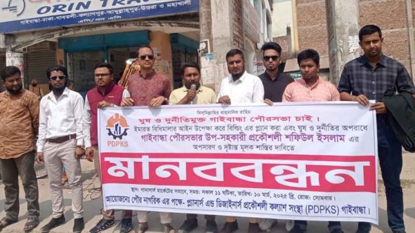 খবরবাড়ি ডেস্কঃ ঘুষ-দূর্ণীতির অভিযোগ তুলে গাইবান্ধা পৌরসভার উপ-সহকারী প্রকৌশলী শফিউল ইসলামের অপসারণের দাবীতে এক মানববন্ধন অনুষ্ঠিত হয়েছে। প্ল্যানার্স এন্ড ডিজাইনার্স প্রকৌশলী কল্যাণ সংস্থার আয়োজনে সোমবার (১০ মার্চ) সকাল ১১টার দিকে