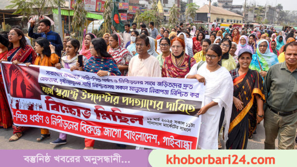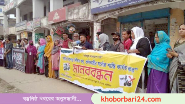 খবরবাড়ি ডেস্কঃ নারীর নিরাপত্তা নিশ্চিতসহ দেশের বিভিন্ন স্থানে ধর্ষণ ও নারী নিপীড়নের ঘটনায় জড়িতদের সর্বোচ্চ শাস্তি নিশ্চিতের দাবীতে ‘গাইবান্ধা উদ্যোক্তাবৃন্দ’ ব্যানারে গাইবান্ধায় মানববন্ধন অনুষ্ঠিত হয়েছে। বুধবার (১২ মার্চ) সকাল ১১টার
