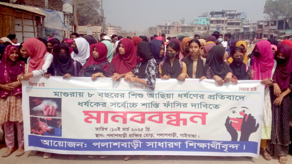 খবরবাড়ি ডেস্কঃ মাগুরায় চাঞ্চল্যকর ৮ বছরের শিশু ধর্ষণের প্রতিবাদ ও ধর্ষকের দৃষ্টান্তমূলক শাস্তির দাবীতে গাইবান্ধার পলাশবাড়ীতে মানববন্ধন ও বিক্ষোভ সমাবেশ অনুষ্ঠিত হয়েছে। সোমবার (১০ মার্চ) সকালে পৌরশহরের পলাশবাড়ী সাধারণ শিক্ষার্থী