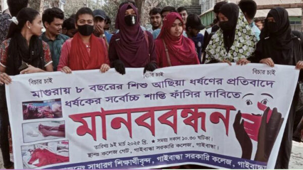 খবরবাড়ি ডেস্কঃ মাগুরায় চাঞ্চল্যকর ৮ বছরের শিশু ধর্ষণের প্রতিবাদ ও ধর্ষকের সর্বোচ্চ শাস্তির দাবীতে গাইবান্ধায় বিক্ষোভ মিছিল ও মানববন্ধন করেছেন শিক্ষার্থীরা। রোববার (৯ মার্চ) সকালে বিক্ষুদ্ধ শিক্ষার্থীরা গাইবান্ধা সরকারি কলেজ