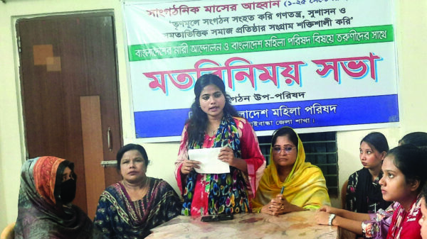 খবরবাড়ি ডেস্কঃ তৃণমূলে সংগঠন সংহত করি, গণতন্ত্র, সুশাসন ও সমতা ভিত্তিক সমাজ প্রতিষ্ঠার সংগ্রাম শক্তিশালী করি। এই শ্লোগানে ১-২৫ সেপ্টেম্বর পর্যন্ত বাংলাদেশ মহিলা পরিষদ সাংগঠনিক মাস পালন উপলক্ষে তরুণীদের সাথে