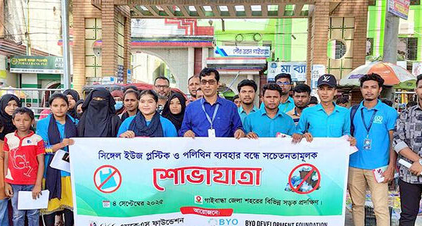 খবরবাড়ি ডেস্কঃ একবার ব্যবহার যোগ্য প্লাস্টিক (সিঙ্গেল ইউজ প্লাস্টিক) এবং পলিথিনের ব্যবহার বন্ধে সচেতনতামূলক গাইবান্ধায় শোভাযাত্রা অনুষ্ঠিত হয়েছে। এ কর্মসূচিতে প্লাস্টিক-পলিথিন বর্জন করে পরিবেশ রক্ষার আহ্বান জানিয়েছেন অংশগ্রহণকারীরা। এসকেএস ফাউন্ডেশন