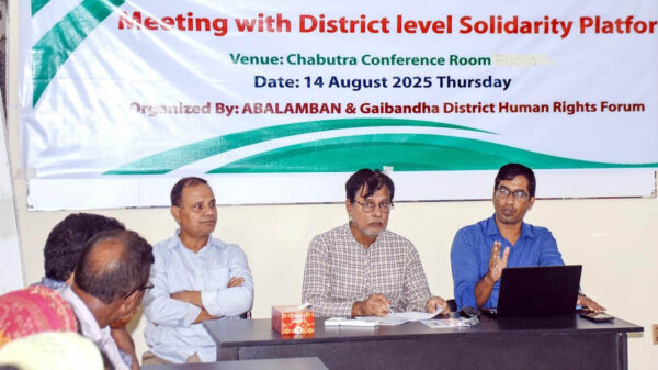 খরববাড়ি ডেস্কঃ গাইবান্ধায় জেলার মানবাধিকার পরিস্থিতি পর্যালোচনা বিষয়ে মতবিনিময় সভা অনুষ্ঠিত হয়েছে। বৃহস্পতিবার (১৪ আগস্ট) সকালে অবলম্বন কার্যালয়ের মিলনায়তনে ইউরোপীয় ইউনিয়ন, ফ্রি প্রেস আনলিমিটেড ও আটিকেল নাইনটিন এর সহযোগিতায় মানবাধিকার