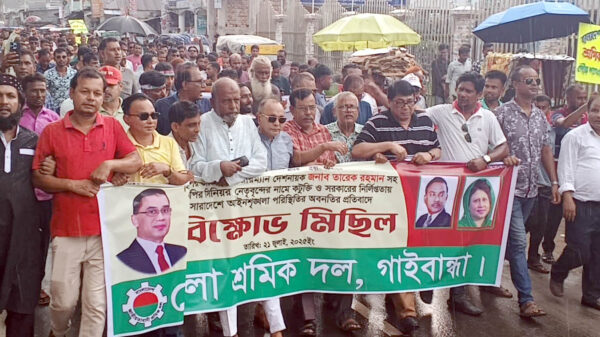 খবরবাড়ি ডেস্কঃ বিএনপির প্রতিষ্ঠাতা শহীদ প্রেসিডেন্ট জিয়াউর রহমানের ছবি অবমাননা এবং দলের ভারপ্রাপ্ত চেয়ারম্যান তারেক রহমান সম্পর্কে কুরুচিপূর্ণ স্লোগান ও কটূক্তির প্রতিবাদে গাইবান্ধায় বিক্ষোভ সমাবেশ অনুষ্ঠিত হয়েছে। সোমবার (২১ জুলাই)