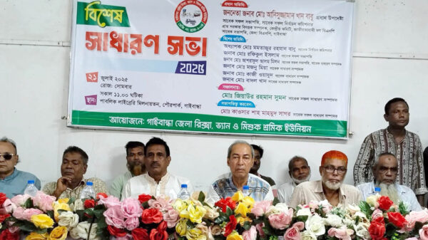 খবরবাড়ি ডেস্কঃ গাইবান্ধা জেলা রিকশা, ভ্যান ও মিশুক শ্রমিক ইউনিয়নের বিশেষ সাধারণ সভা অনুষ্ঠিত হয়েছে। সোমবার (২১ জুলাই) সকাল ১১টায় গাইবান্ধা পাবলিক লাইব্রেরি মিলনায়তনে এ সভা অনুষ্ঠিত হয়। সভায় প্রধান