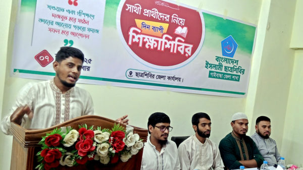 খবরবাড়ি ডেস্কঃ বাংলাদেশ ইসলামী ছাত্রশিবির গাইবান্ধা জেলা শাখার উদ্যোগে জেলা কার্যালয়ে সাথী প্রার্থীদের নিয়ে দিনব্যাপী শিাশিবির অনুষ্ঠিত হয়েছে। শুক্রবার (৭ নভেম্বর) সকালে জেলা শিবির সভাপতি মো. ফেরদৌস সরকার রুম্মানের সভাপতিত্বে