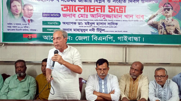 খবরবাড়ি ডেস্কঃ ঐতিহাসিক ৭ নভেম্বর জাতীয় বিপ্লব ও সংহতি দিবস উপলক্ষে গাইবান্ধা জেলা বিএনপির আয়োজনে আলোচনা সভা অনুষ্ঠিত হয়েছে। শুক্রবার (৭ নভেম্বর) বিকেলে জেলা বিএনপির সাধারণ সম্পাদক জনাব মাহামুদুন্নবী টিটুল