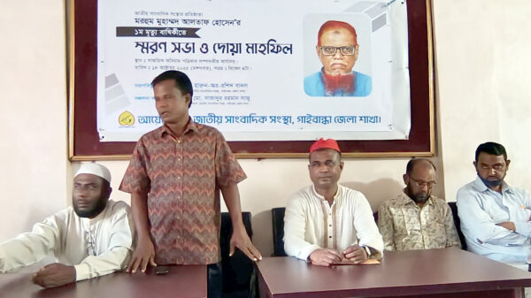 খবরবাড়ি ডেস্কঃ জাতীয় সাংবাদিক সংস্থার প্রতিষ্ঠাতা মরহুম মোহাম্মদ আলতাফ হোসেনের ১ম মৃত্যু বার্ষিকী উপলক্ষে গাইবান্ধায় স্মরণসভা ও দো’আ মাহফিল অনুষ্ঠিত হয়েছে। জাতীয় সাংবাদিক সংস্থা, গাইবান্ধা জেলা শাখা আয়োজনে মঙ্গলবার (১৪