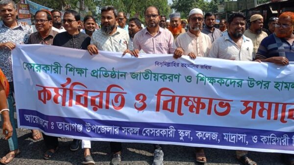 এম. এ. শাহীন,তারাগঞ্জ,রংপুরঃ বেসরকারি শিক্ষা প্রতিষ্ঠান জাতীয়করণ ও শিক্ষকদের ওপর হামলার প্রতিবাদে রংপুরের তারাগঞ্জে মানববন্ধন ও বিক্ষোভ কর্মসূচি অনুষ্ঠিত হয়েছে। মঙ্গলবার (১৪ অক্টোবর) সকাল ১১টা থেকে দুপুর ১টা পর্যন্ত উপজেলা