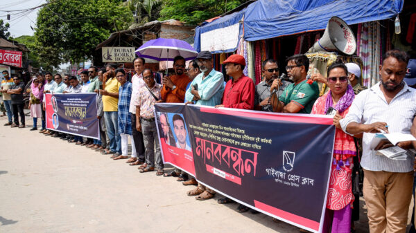 খবরবাড়ি ডেস্কঃ গাইবান্ধায় ৩ সাংবাদিকের বিরুদ্ধে মিথ্যা মামলা দায়েরের প্রতিবাদে মানববন্ধন কর্মসূচি অনুষ্ঠিত হয়েছে। শনিবার (৪ অক্টোবর) দুপুরে গাইবান্ধা প্রেস ক্লাবের উদ্যোগে কাচারী বাজার চত্বরে এ কর্মসূচি পালন করা হয়।