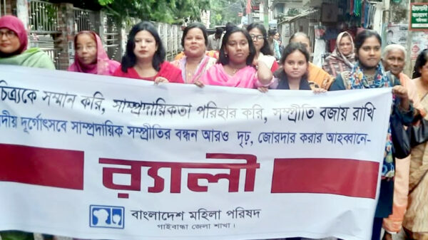 খবরবাড়ি ডেস্কঃ ২৮ সেপ্টেম্বর হিন্দু ধর্মাবলম্বীদের প্রধান ধর্মীয় উৎসব শারদীয় দূর্গোৎসব উপলক্ষে বাংলাদেশ মহিলা পরিষদ গাইবান্ধা জেলা শাখার আয়োজনে সাম্প্রায়িক সম্প্রীতির বন্ধন আরো দৃঢ়, জোরদার করার আহব্বান জানিয়ে র্যালী ও