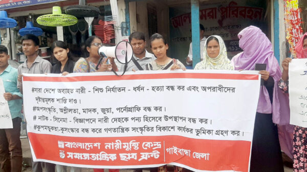 খবরবাড়ি ডেস্কঃ গাইবান্ধার সুন্দরগঞ্জ উপজেলায় সপ্তম শ্রেণির এক ছাত্রীকে সংঘবদ্ধ ধর্ষণের প্রতিবাদে এবং জড়িতদের দ্রুত গ্রেফতারসহ দৃষ্টান্তমূলক শাস্তির দাবীতে বিক্ষোভ মিছিল ও সমাবেশ অনুষ্ঠিত হয়েছে। বাংলাদেশ নারী মুক্তি কেন্দ্র ও