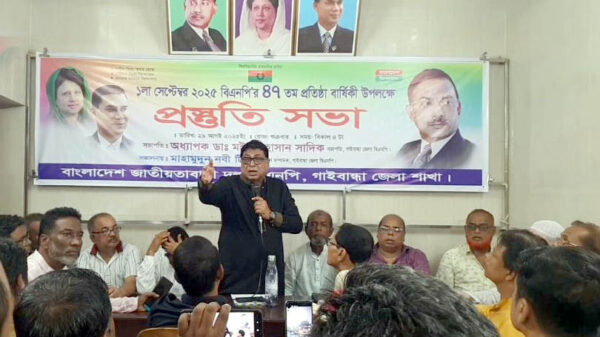 খবরবাড়ি ডেস্কঃ আগামী ১ সেপ্টেম্বর-২০২৫ বাংলাদেশ জাতীয়তাবাদী দল (বিএনপি)-এর ৪৭তম প্রতিষ্ঠাবার্ষিকী পালন উপলক্ষে এক প্রস্তুতি সভা অনুষ্ঠিত হয়েছে। গাইবান্ধা জেলা বিএনপির আয়োজনে শুক্রবার (২৯ আগস্ট) বিকেলে শহরের সার্কুলার রোডস্থ দলীয়