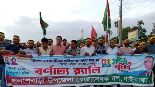 খবরবাড়ি ডেস্কঃ বাংলাদেশ জাতীয়তাবাদী স্বেচ্ছাসেবক দলের ৪৫তম প্রতিষ্ঠাবার্ষিকী উপলক্ষে গাইবান্ধার পলাশবাড়ীতে বর্ণাঢ্য র্যালী ও আলোচনা সভা করেছে উপজেলা স্বেচ্ছাসেবক দল। বুধবার (২০ আগস্ট) বিকেল ৫টার দিকে উপজেলা স্বেচ্ছাসেবক দলের উদ্যোগে