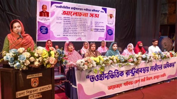 খবরবাড়ি ডেস্কঃ উগ্রবাদ, সাম্প্রদায়িকতা, ধর্মীয় উন্মাদনা, নারী নির্যাতন ও গুজব-সন্ত্রাসের বিরুদ্ধে জনসচেতনতা সৃষ্টির লক্ষ্যে তওহীদভিত্তিক রাষ্ট্রব্যবস্থায় নারীদের অধিকার শীর্ষক এক আলোচনা সভা অনুষ্ঠিত হয়েছে। রোববার (১৭ আগস্ট) গাইবান্ধা জেলা শিল্পকলা