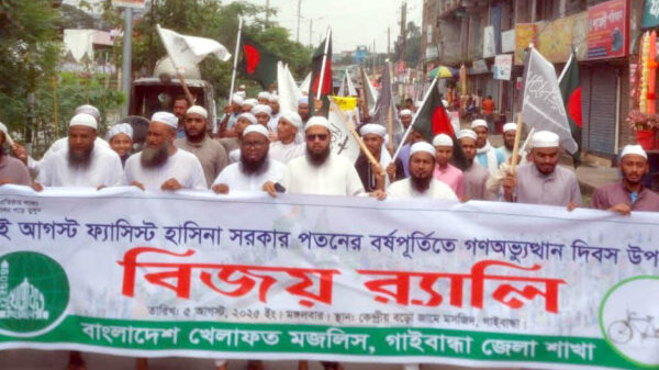 খবরবাড়ি ডেস্কঃ জুলাই গণ-অভ্যুত্থান বিজয় দিবস উপলক্ষে কেন্দ্রীয় কর্মসূচীর অংশ হিসেবে বাংলাদেশ খেলাফত মজলিস গাইবান্ধা জেলা শাখার উদ্যোগে বিজয় র্যালী অনুষ্ঠিত হয়েছে। মঙ্গলবার (৫ আগস্ট) দুপুরে বাংলাদেশ খেলাফত মজলিস গাইবান্ধা
