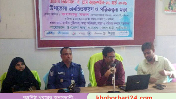 খবরবাড়ি ডেস্কঃ গাইবান্ধার পলাশবাড়ীতে জাতীয় ভিটামিন ‘এ’ প্লাস ক্যাম্পেইন অবহিতকরণ ও পরিকল্পনা সভা অনুষ্ঠিত হয়েছে। বুধবার (১২ মার্চ) সকালে উপজেলা স্বাস্থ্য কমপ্লেক্স হলরুমে উপজেলা স্বাস্থ্য ও পরিবার পরিকল্পনা কর্মকর্তা ডা.